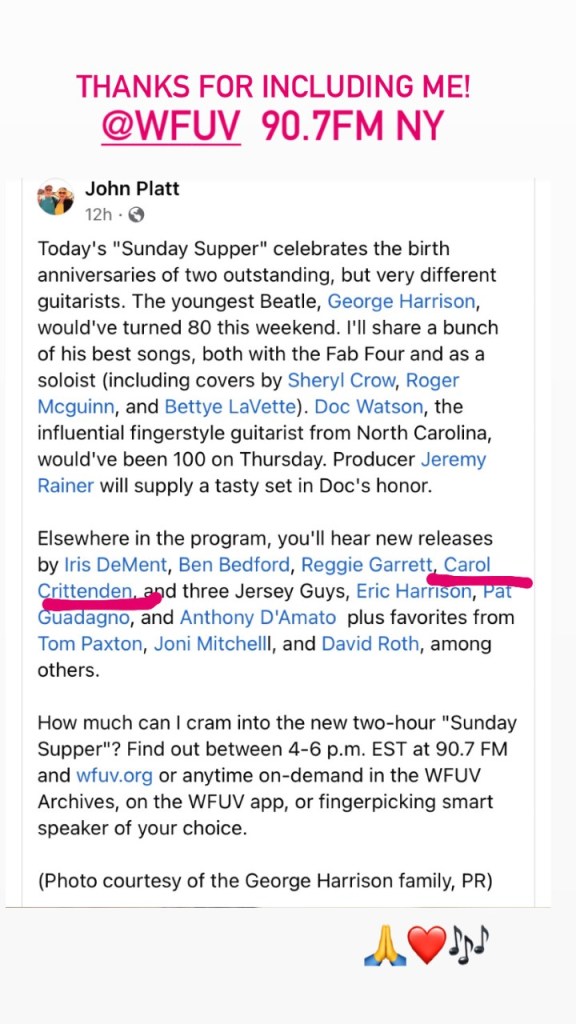 WFUV 90.7FM NY Radio Airplay Feb 26th, 2023 Posted on February 26, 2023March 18, 2023 by carolcritt Winter’s Wish Share this: Click to share on X (Opens in new window) X Click to share on Facebook (Opens in new window) Facebook Like Loading... Related