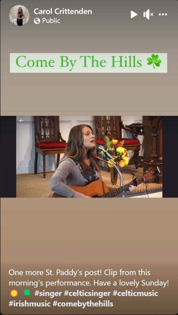 A little St. Paddy’s spirit… Posted on March 20, 2023March 21, 2023 by carolcritt Sunday, March 19, 2023, 10:30am: Carol performs “Come By The Hills” at Presbyterian Church of Leonia’s service. Share this: Click to share on X (Opens in new window) X Click to share on Facebook (Opens in new window) Facebook Like Loading... Related