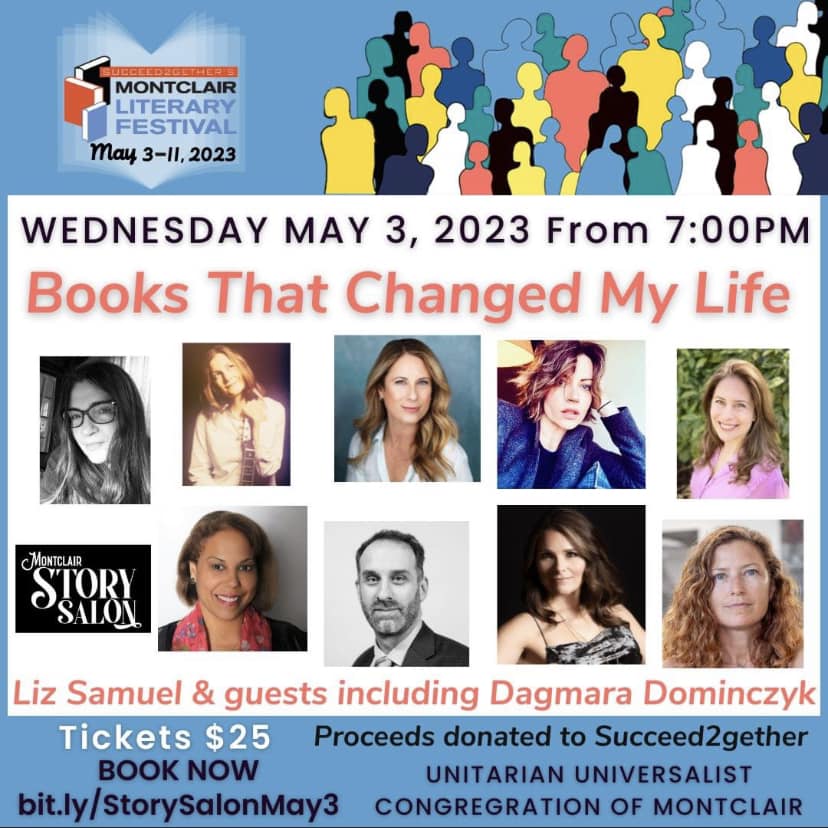 Montclair Story Salon has teamed up with Succeed2gether’s Montclair Literary Festival to bring you a story salon full of incredible storytellers and performing artists! We have the uber talented actress and author Dagmara Wilson (Dagmara Dominczyk: Succession, Hello Tomorrow, The Lost Daughter), the brilliant and entertaining, Eric Roston (Bloomberg climate change journalist), the wonderful writer Nicole Gray and the vibrant author and activist, Rachael Quinn Egan! And of course we will have our usual Montclair Story Salon regulars (who are anything but “regular”!) Rachel Martens will be back with fresh, new story…Stacia Thiel and Carol Crittenden will be bringing us their gorgeous tunes and our resident artist Merrie Koehlert will be creating a work of art LIVE all to benefit Succeed2gether! I’ll be hosting and bringing you an exciting, even bigger version of the Montclair Story Salon: BOOKS THAT CHANGED MY LIFE. ![]()