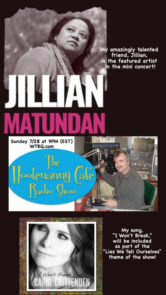 Sunday, July 28, 2024, 9pm (EST): My amazingly talented friend, Jillian Matundan, is the featured artist on Jon Stein’s Hootenanny Cafe radio show, airing tonight! My song, “I Won’t Break,” will be included as part of the “Lies We Tell Ourselves” theme of the show! Thanks Jon Stein! WTBQ.com
