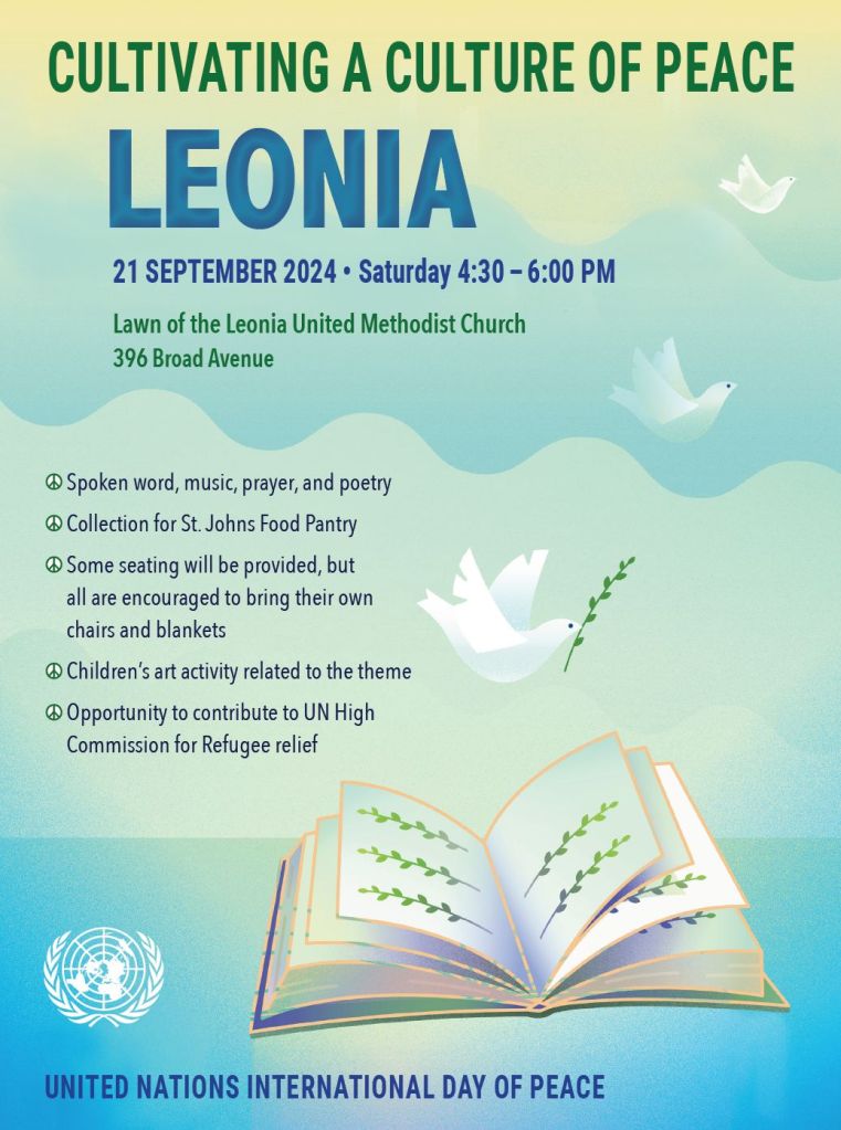 Saturday, September 21, 2024, 4:30pm: Carol is happy to, once again, share some music at this worthwhile event. This year’s theme is “Cultivating a Culture of Peace.” Leonia, NJ
