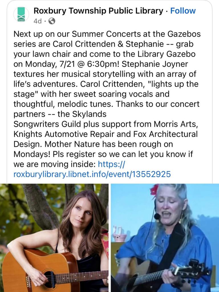 Roxbury Library Gazebo Concert Posted on July 15, 2025July 23, 2025 by carolcritt Monday 7/21/25, 6:30pm, 103 Main Street, Succasunna, NJ 07876 Share this: Click to share on X (Opens in new window) X Click to share on Facebook (Opens in new window) Facebook Like Loading... Related