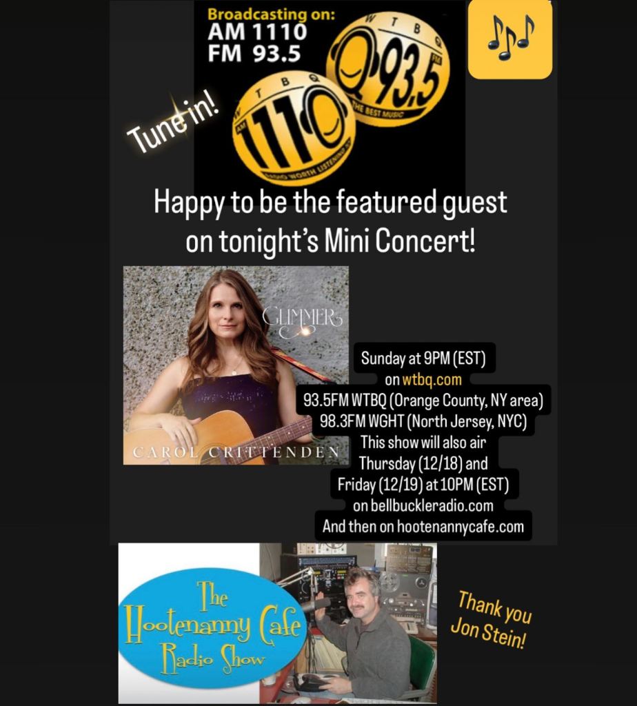 Carol Crittenden Mini Concert on WTBQ-FM Hootenanny Cafe with Jon Stein Posted on December 20, 2025January 18, 2026 by carolcritt Sunday, December 14, 2025: Click here and click on the December 14, 2025 show to listen to Carol’s Mini Concert, featuring songs from Glimmer! Share this: Share on X (Opens in new window) X Share on Facebook (Opens in new window) Facebook Like Loading... Related